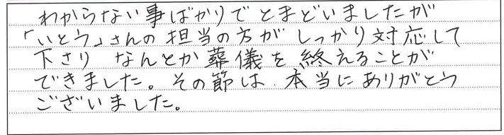 わからない事ばかりでとまどいましたが「いとう」さんの担当の方がしっかり対応して下さりなんとか葬儀を終えることができました。