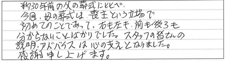 約30年前の父の葬式に比べ、今回、母の葬式は喪主という立場で初めてのことであって、右も左も前も後ろも分からないことばかりでした。