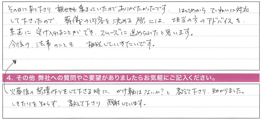火葬後の祭壇作りをして下さる時に、掛け軸はないか?と教えて下さり助かりました。