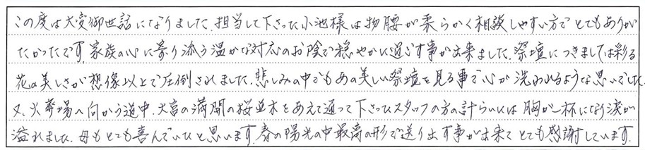 又、火葬場へ向かう道中、大宮の満開の桜並木をあえて通って下さったスタッフの方の計らいには胸が一杯になり涙が溢れました。母もとても喜んでいたと思います。