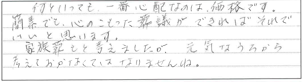 突然のことで何かと慣れないことが多い中、ご担当の方の適切な対処や、アドバイスに大変助けられました。お寺様との調整や役所対応などもやってくださり、滞りなく母を送ることができました。 家族葬にしていただきましたが、会場は広く、祭壇も、リクエスト通りかわいらしくきれいに飾ってくださり、会葬の方々にも母のイメージにぴったりだねと言っていただきました。 ありがとうございました。……